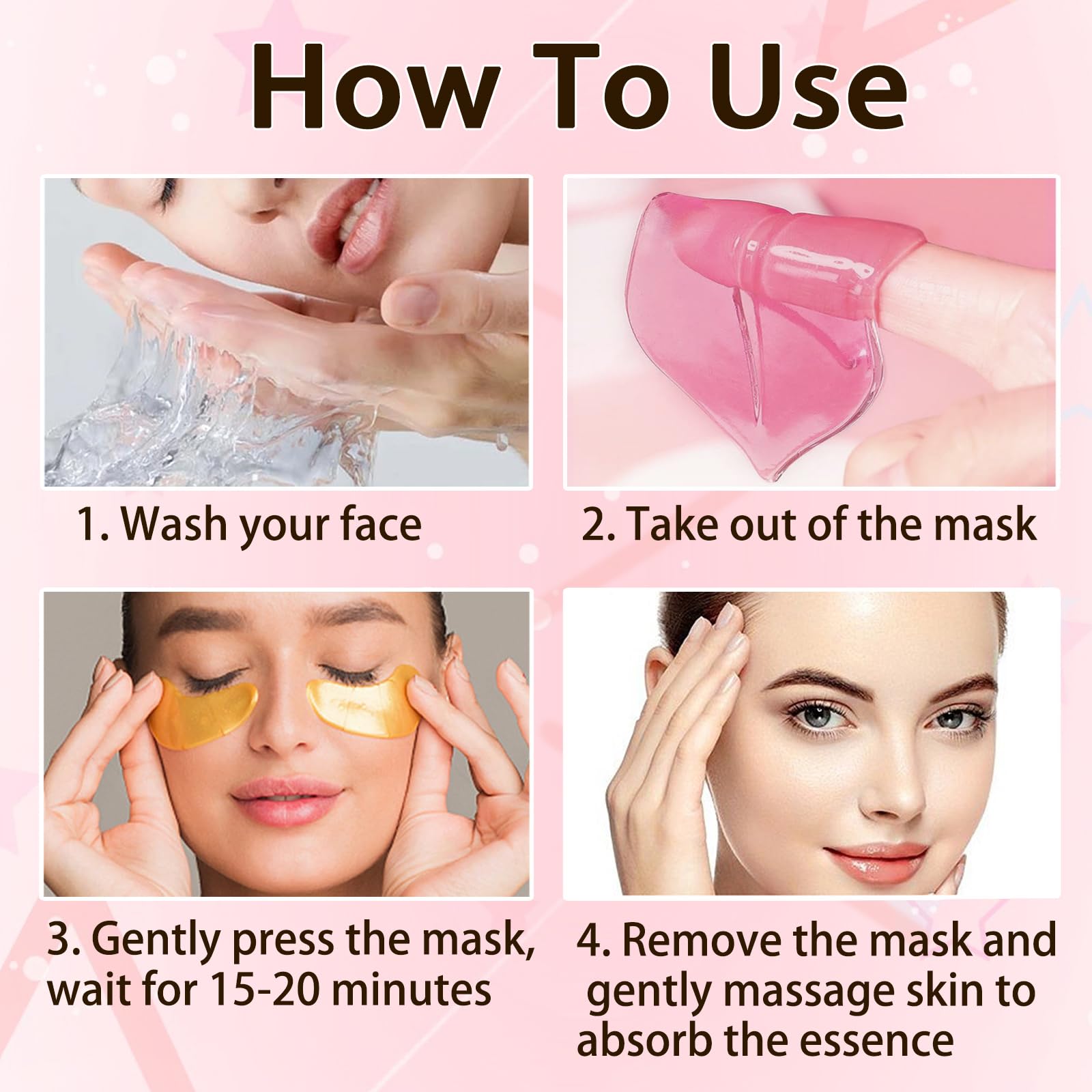 【Moisturizing & Hydrating】Our collagen lip masks & dark circles under eye treatment eye mask are enriched with moisturizing essence that will quickly penetrate into the skin and significantly hydrate your skin, providing the nutrients and moisture it needs to make your lips and eyes more attractive. Continuous use will have obvious results.