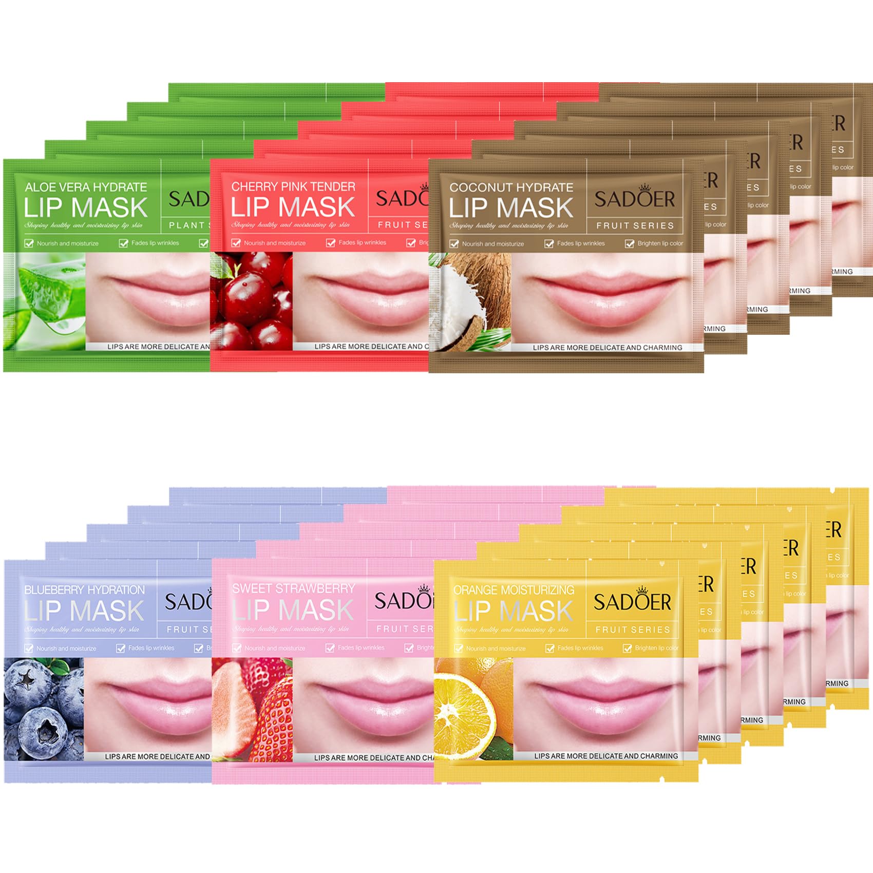 6 Flavours for Multiple Pleasures: This 30 pcs fruit lip mask set containing in 6 flavors!(Strawberry - Blueberry - Orange - Coconut - Cherry - Aloe Vera) Treat your lips to a luxurious spa experience every day with your choice of daily flavors.