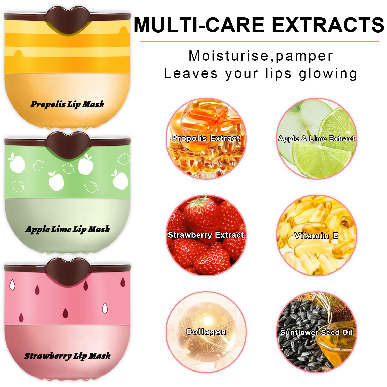 3Pcs Lip Balm Honey Pot with Stick, Honey Strawberry Apple Moisturizing and Hydrating Sleeping Lip Mask, Day and Night Repair and Care, Improve Lip Color, Reduce Lip Lines (SET A)