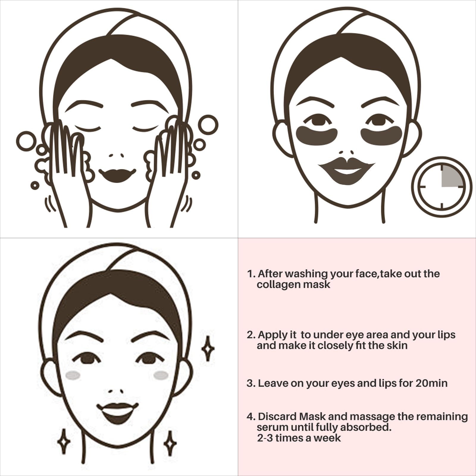 Easy To Use - After cleansing your lips and eyes, open the package, take out the mask and apply it on your eyes and lips. leave on for 15-20 minutes. Discard Mask and massage the remaining serum until fully absorbed.2-3 times a week