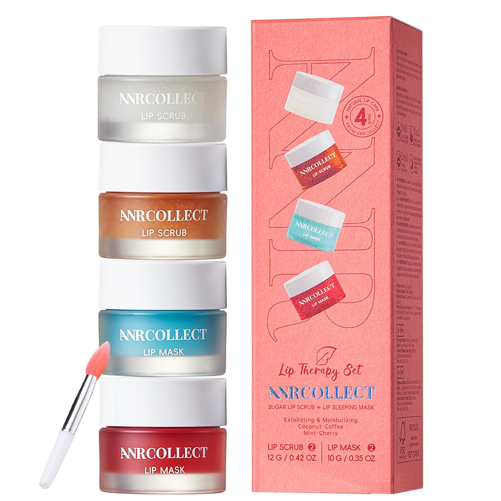 Overnight Lip Care Duo - Pamper your lips with ANRCOLLECT's nourishing 2-step routine featuring a gentle lip scrub exfoliator and hydrating sleeping lip mask. This 4-piece set includes 2 ultra-moisturizing lip masks for overnight hydration and 2 smoothing lip exfoliators to prep lips. The lip scrub buffs away dry flakes while the sleeping mask works through the night to reveal softer, smoother lips by morning. Perfect for creating a luxurious at-home lip care ritual.