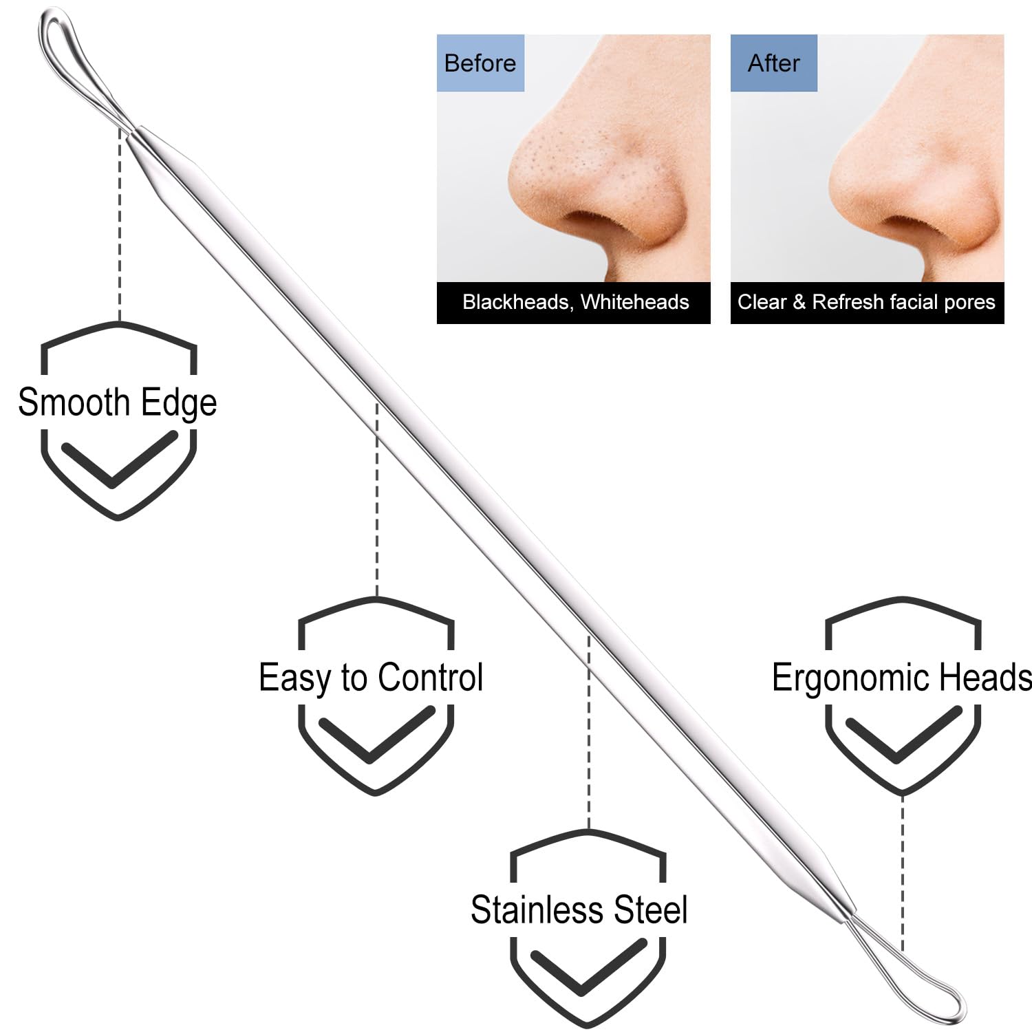 Blackhead Remover Tools: Features 4 specialized ends - 1 sharp pimple needle and 3 graduated loops (small to large) to effectively extract all blackhead sizes