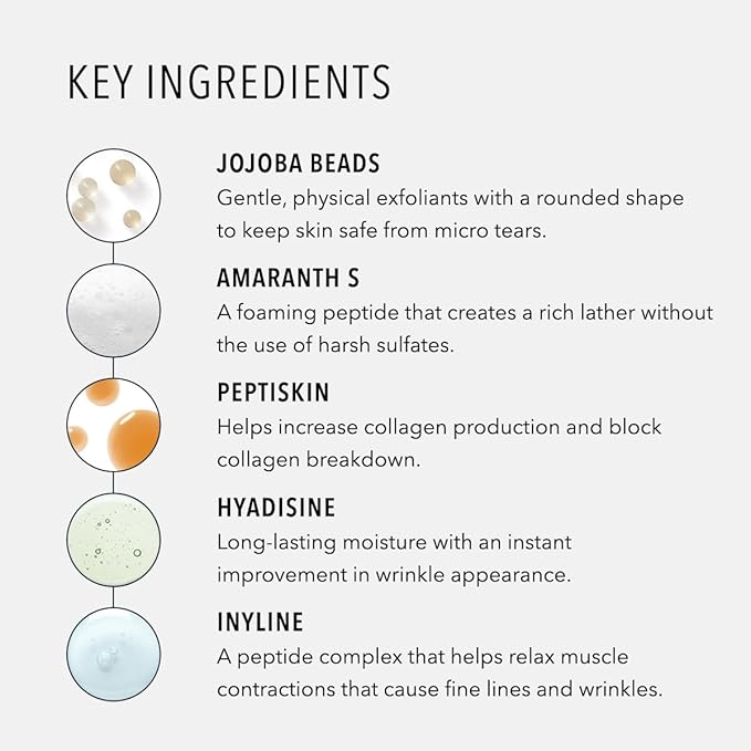 • Healthy Cell Renewal: Gentle physical exfoliation combined with collagen-boosting a& wrinkle relaxing peptides promotes cell renewal, inproves radiance while diminishing fine lines & wrinkles