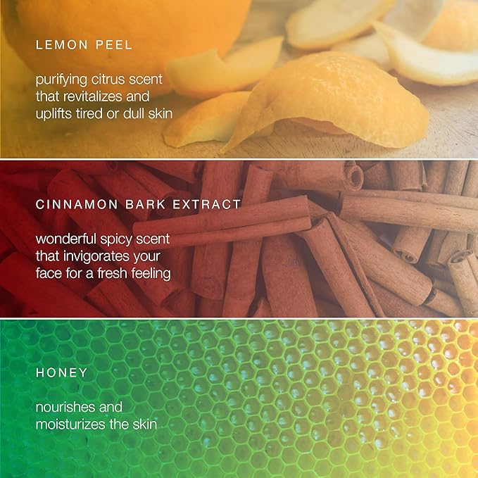• A FACE CLEANSER WITH LEMON, HONEY & CINNAMON: Cinnamon bark extract invigorates your face for a fresh feeling, honey adds a hydrating face wash touch, and Lemon Peel revitalizes and uplifts tired, dull skin.