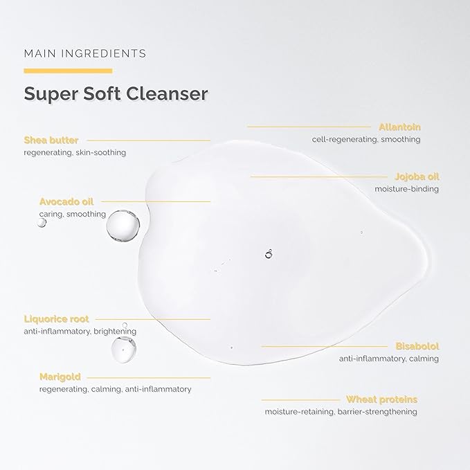 • SOPHISTICATED: Our combination of ingredients, including Shea Butter, Marigold, Avocado Oil and Wheat Proteins, causes the moisture-retaining and regenerating effect of the Super Soft Cleanser.