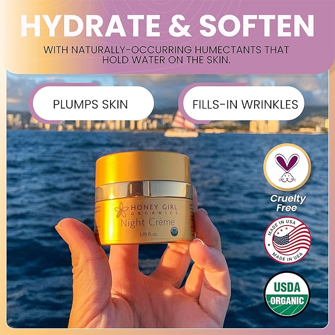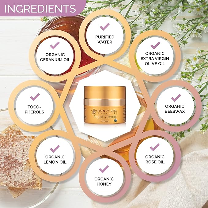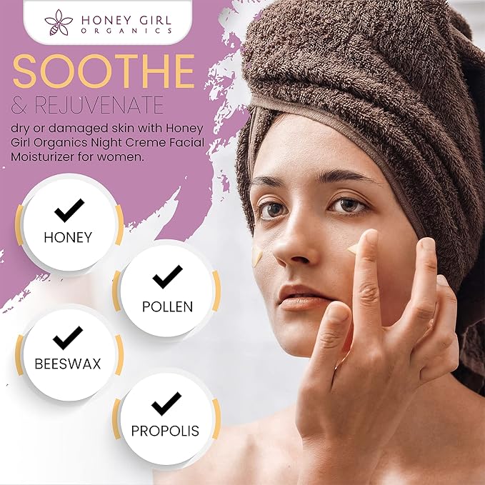 • SOOTHE AND REJUVENATE dry or damaged skin with Honey Girl Organics Night Creme. Nutrient-rich organic honey* and organic beeswax* stimulate skin repair as you sleep. *naturally contains pollen, propolis & royal jelly