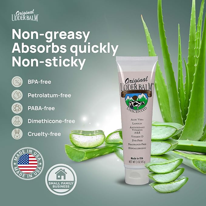• 100% MADE IN THE USA. All of our ingredients and packaging are sourced locally. Having been on the market for over 40 years, this creamy udder balm is so effective it's also used as chamois butter (anti blister balm) or aloe vera moisturizer face cream. Great after sun care with aloe vera.
