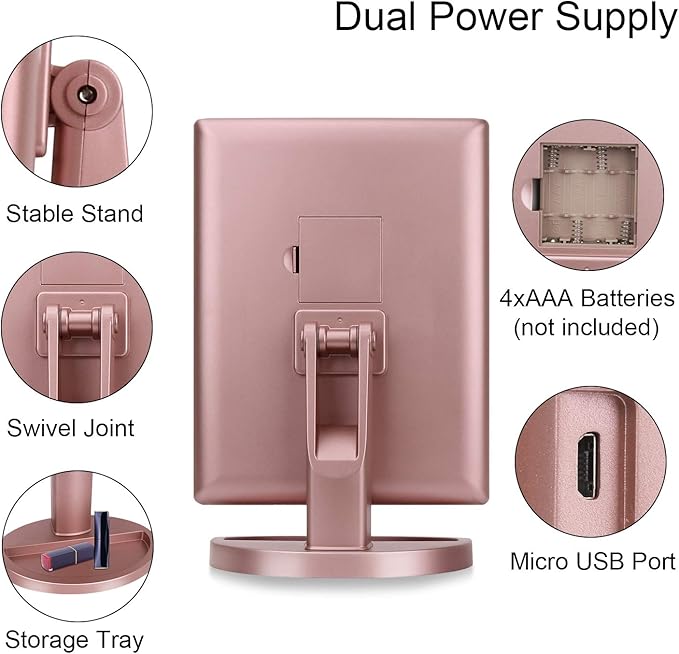 • Dual power supply modes:Operated by Micro USB cable supply or 4AAA batteries( battery not included, usb wire included) , pls noted the mirror can't store power by itself, you can't charge the batteries too.