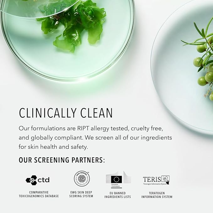 • Clinically Clean: Free from genotoxins, parabens, phthalates, sulfates, and harmful fragrance. Our formulations are RIPT allergy tested, cruelty free, & globally compliant. We screen all of our ingredients for skin health & safety
