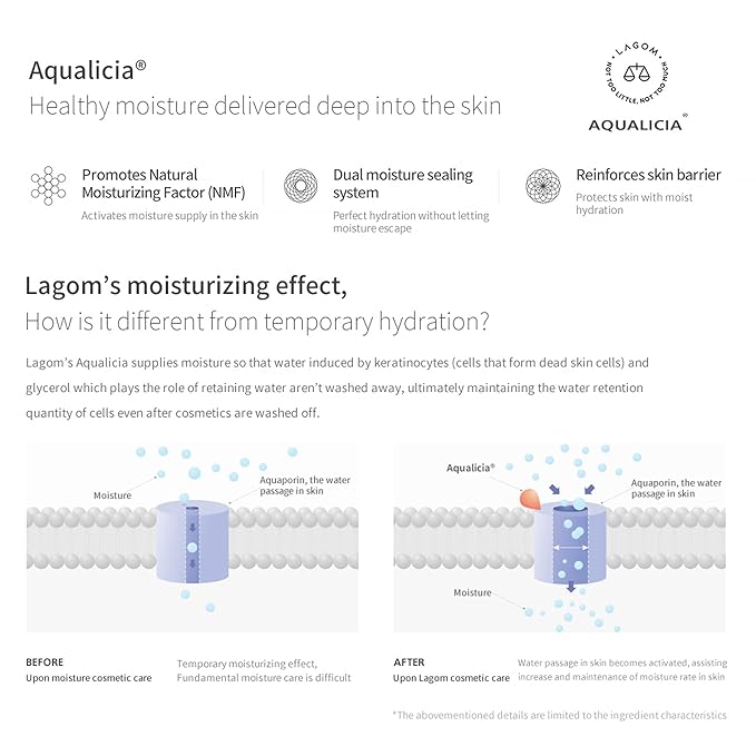 • PATENTED INGREDIENT HELPS WIDEN MOISTURE CHANNELS: Lagom’s patented Aqualicia, a peptide derived from the Acacia tree, helps facilitate Aquaporins, a Nobel Prize-winning discovery known as the water channels in the cell membrane, assisting water molecules to flow deep and retain moisture in the skin.
