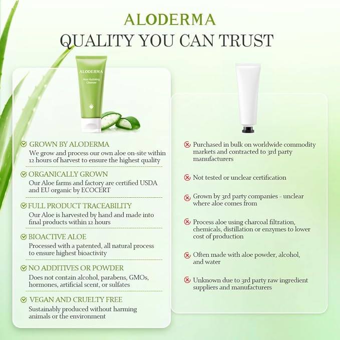 • Made Within 12 Hours of Harvest: At Aloderma, our skincare is rooted in the earth. Our Aloe is processed on-site and turned into final products within hours of leaving the fields to ensure that we capture the natural power of Aloe Vera in every product we make.