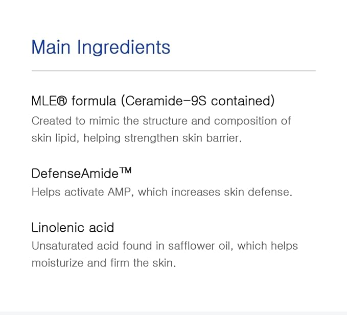 • Active Ingredients : Water, Glycerin, Propanediol, Caprylic/capric triglyceride, Cetearyl alcohol, Sorbitan stearate, Carthamus Tinctorius (safflower) seed oil, Glyceryl stearate, Stearic acid, Myristoyl/palmitoyl oxostearamide/arachamide MEA(Ceramide), Methyl caprooyl tyrosinate(Defensamide), Phytosterols, Tocopheryl acetate, Bisabolol, Xanthan gum, Sodium hyaluronate, Dimethicone, 1,2-hexanediol, Caprylyl glycol, Tropolone Water, Glycerin, Propanediol, Caprylic/capric triglyceride, Cetearyl alcohol, Sorbitan stearate, Carthamus Tinctorius (safflower) seed oil, Glyceryl stearate, Stearic acid, Myristoyl/palmitoyl oxosteara… See more