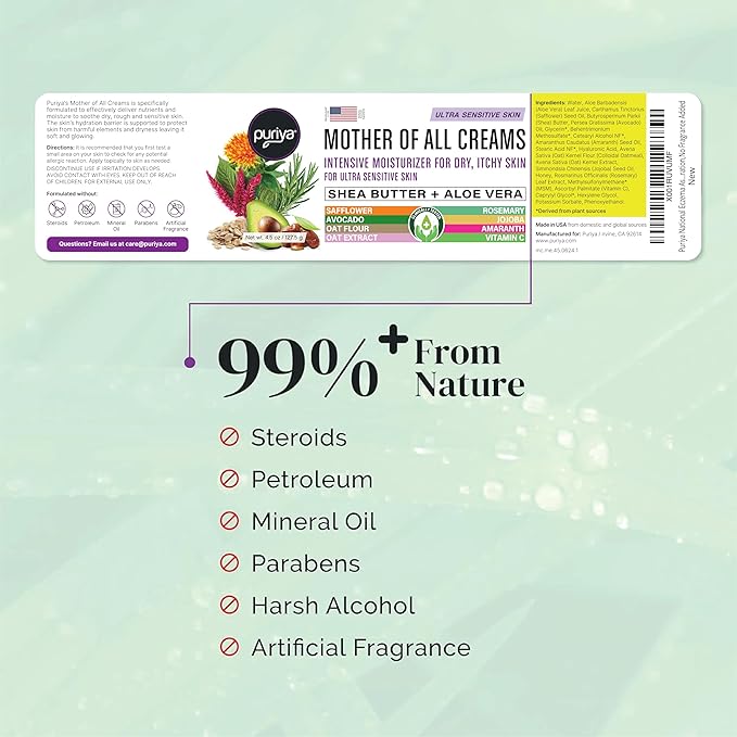 Puriya National Eczema Association Accepted Cream 4.5 oz, Dry Itchy Skin Relief, Colloidal Oatmeal Lotion, For Kids, Adults, Face, Hands, Mother of All Creams, Plant-Based Hydration,No Fragrance Added