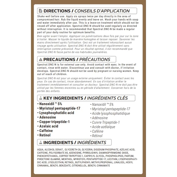 • Active Ingredients : 5% Nanoxidil, Azelaic Acid, Caffeine, Adenosine, Pyrrolidinyl Diaminopyrimidine Oxide, Tricopper Peptides, Lecithin, Piroctone Olamine, peptides 5% Nanoxidil, Azelaic Acid, Caffeine, Adenosine, Pyrrolidinyl Diaminopyrimidine Oxide, Tricopper Peptides, Lecithin, Piroctone Olamine, peptides