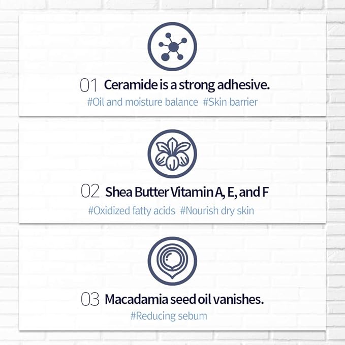 • 3-LAYER SKIN BARRIER - Ceramide in the cream plays the role of mortar which prevents moisture evaporation, adjusting oil and moisture balance properly while reinforcing an imbalanced skin barrier. Moreover, Shea Butter and Macadamia seed oil nurishes dry skin and reduce sebum resulting from aging skin.