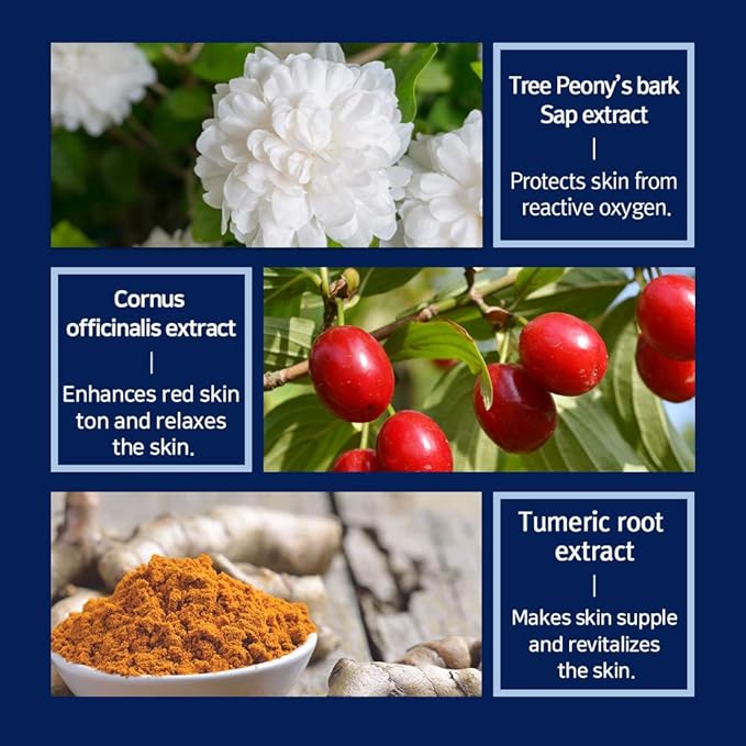 • ANTIOXIDATION FROM 3 NATURAL EXTRACTS - Instead of Retinol chemical ingredient, the cream concentrates the nature ingredients - Tree Peony's bark Sap extract, Cornus officinalis extract, Tumeric root extract. 3 natural ingredients can protect skin from reactive oxygen, enhances red skin ton and relaxes the skin gently.