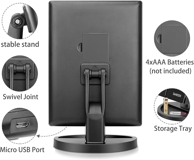 • Dual power supply mode:Operated by Micro USB cable supply or 4AAA batteries( battery not included, usb wire included) , pls noted the mirror can't store power by itself.