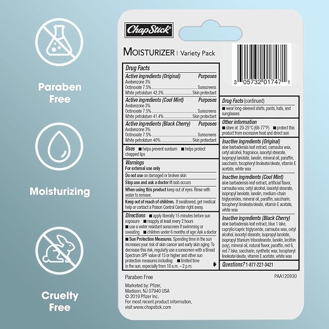 • LIP CARE WITH SUN PROTECTION: Keep your lips ultra-hydrated and protected from the sun’s rays. The ChapStick Moisturizer 2-in-1 Lipcare variety 3-pack includes Original, Black Cherry, and Cool Mint.