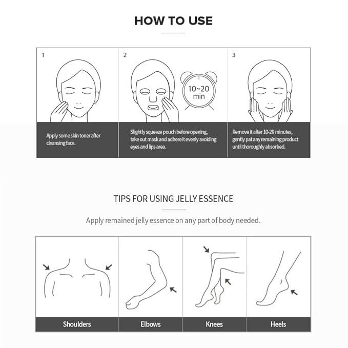 • Cooling Effect: Infused with ice plant extract and menthol to provide an instant cooling sensation, reducing skin temperature by up to 5°C. This set includes 10 Korean jelly face masks designed to deeply hydrate and nourish your skin for a radiant glow.