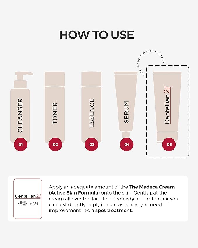 • CENTELLIAN 24 MADECA CREAM (SEASON 5, 50ml/1.7fl oz) - TECA (titrated extract of centella asiatica) and centella asiatica, coupled with hyaluronic acid, collagen, elastin, ceramide, and phospholipids help soothe and calm sensitive skin.