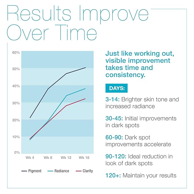 • PROFESSIONAL LEVEL RESULTS: Dark Spots + Hyperpigmentation + Skin Tone Clarity + Lines + Firmness + Lift + Brightness + Radiance. Brighter skin tone, improved clarity and radiance within 14-21 days. Results accelerate in 60-90 days with dramatic improvements in the appearance of dark spots and hyperpigmentation. Results continue to improve over time with long-term use.