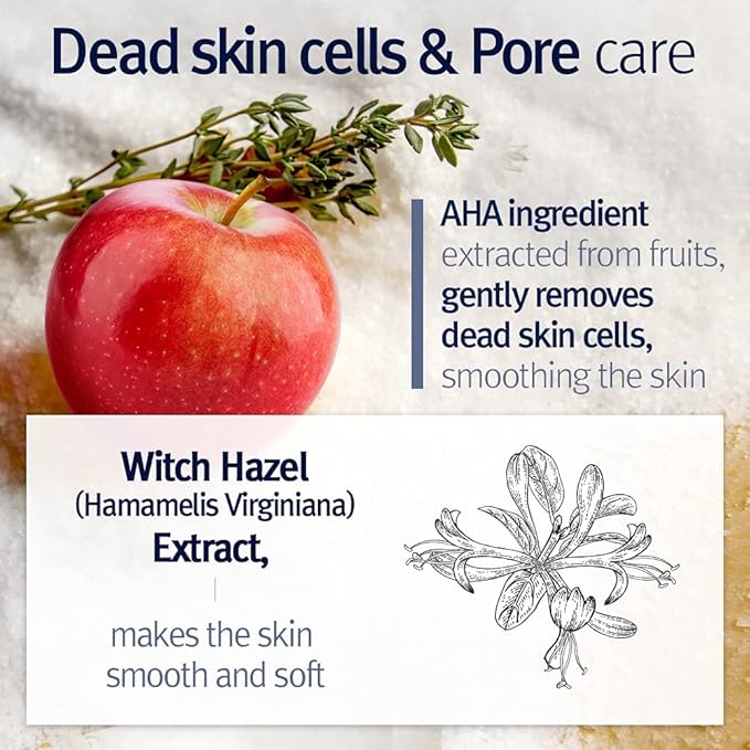 • CARE FOR DEAD SKIN CELLS AND PORES - AHA ingredients which stands for Alpha Hydroxy Acid derived from natural fruits gently cares dead skin cells to become smooth and soft. Witch Hazel's astringent effect that tights the loosen pores, skin is left softer and healthier looking.