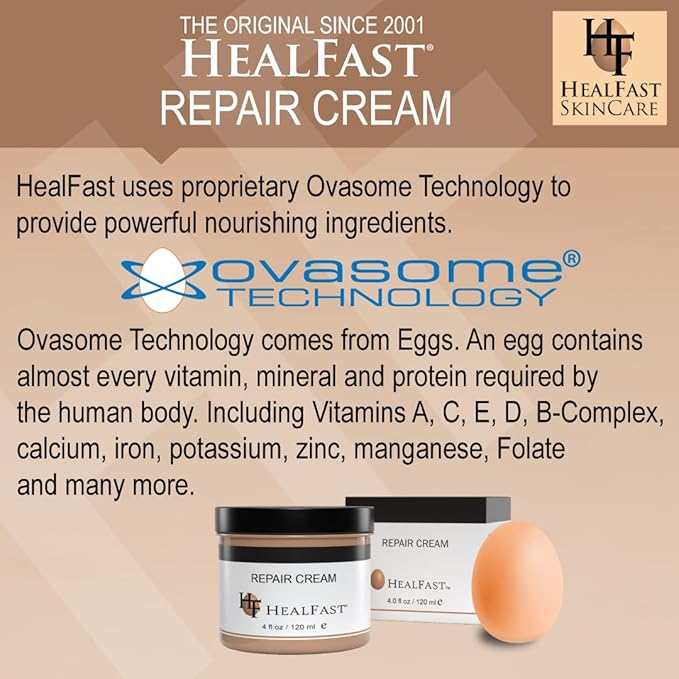 • Advanced Skin Healing Formula: HealFast Skin Repair Cream utilizes Ovasome Technology, providing essential vitamins, minerals, and proteins from herbal and food-based ingredients. This nutrient-rich environment promotes fast healing for dry, irritated, or damaged skin, making it perfect for rashes, burns, stretch marks, and more. Its gentle, nourishing formula can be used by all ages, from babies to adults, for head-to-toe skin repair.