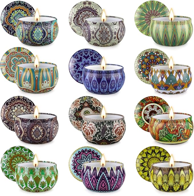 • 12 stress relief fragrances,scented candles sets includes 12 popular scent,Mexican Orange Blossom, Beach Holiday, Lemon Verbena, Cranberry Clove, Figs&Firs, Vinilla Cream, English Toffee Crunch, Tobacco&Teak, Twilight Lavender, Ponderosa Pine, Saffron&Sandalwood, Winter Moss&Mahogany.