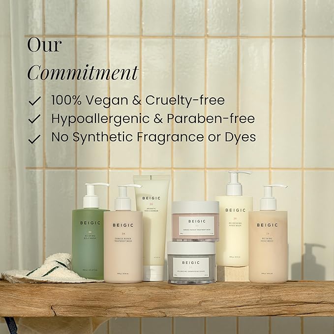 • BEIGIC products are vegan, cruelty-free and devoid of synthetic fragrances, artificial colors, harsh sulfates, parabens, and mineral oils.