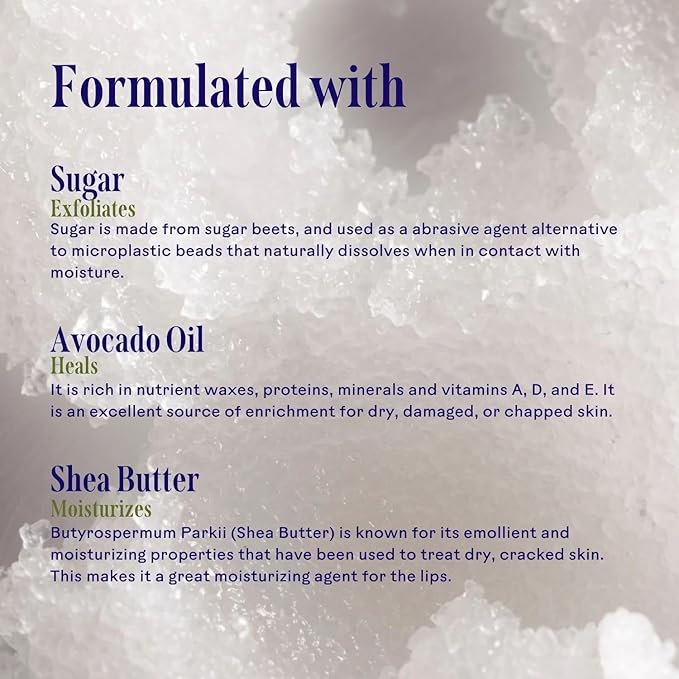 • INTENSIVE LIP MOISTURIZER: After the sugar flakes in this hydrating lip polish have removed dead, peeling skin, Avocado Oil is able to penetrate more deeply, smoothing and replenishing moisture, while Shea Butter is soothing to lips in need of repair.