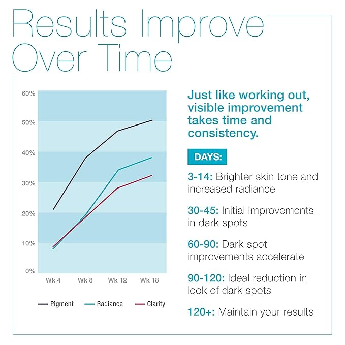 • PROFESSIONAL LEVEL RESULTS: Dark Spots + Hyperpigmentation + Skin Tone Clarity + Lines + Firmness + Lift + Brightness + Radiance. Brighter skin tone, improved clarity and radiance within 14-21 days. Results accelerate in 60-90 days with dramatic improvements in the appearance of dark spots and hyperpigmentation. Results continue to improve over time with long-term use.