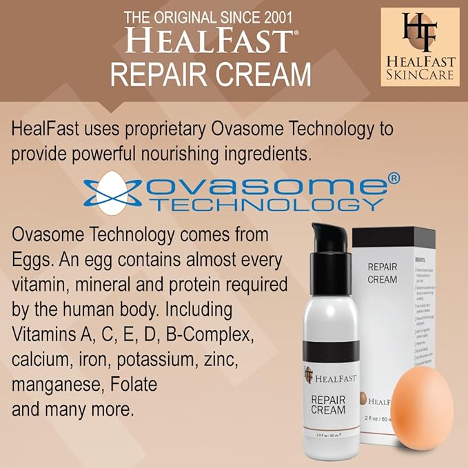 • Advanced Skin Healing Formula: HealFast Skin Repair Cream utilizes Ovasome Technology, providing essential vitamins, minerals, and proteins from herbal and food-based ingredients. This nutrient-rich environment promotes fast healing for dry, irritated, or damaged skin, making it perfect for rashes, burns, stretch marks, and more. Its gentle, nourishing formula can be used by all ages, from babies to adults, for head-to-toe skin repair.