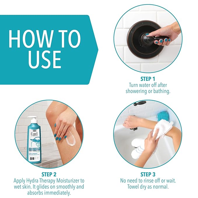 • SKIN HYDRATION WITH NO RESIDUE - Curel fast absorbing lotion allows for wet, in-shower application and immediate absorption so you can towel off and go