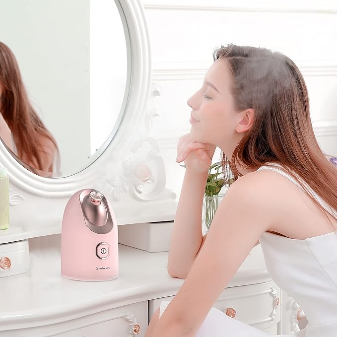 Newbealer Facial Steamer, Mini Aroma Face Steamer, Nano Ionic Hot Mist Facial Humidifier Atomizer, Home Sauna Spa Sprayer Moisturizing Cleansing Pores, 9 Pieces Acne Remover Kit (Pink-Gold, 160ml)