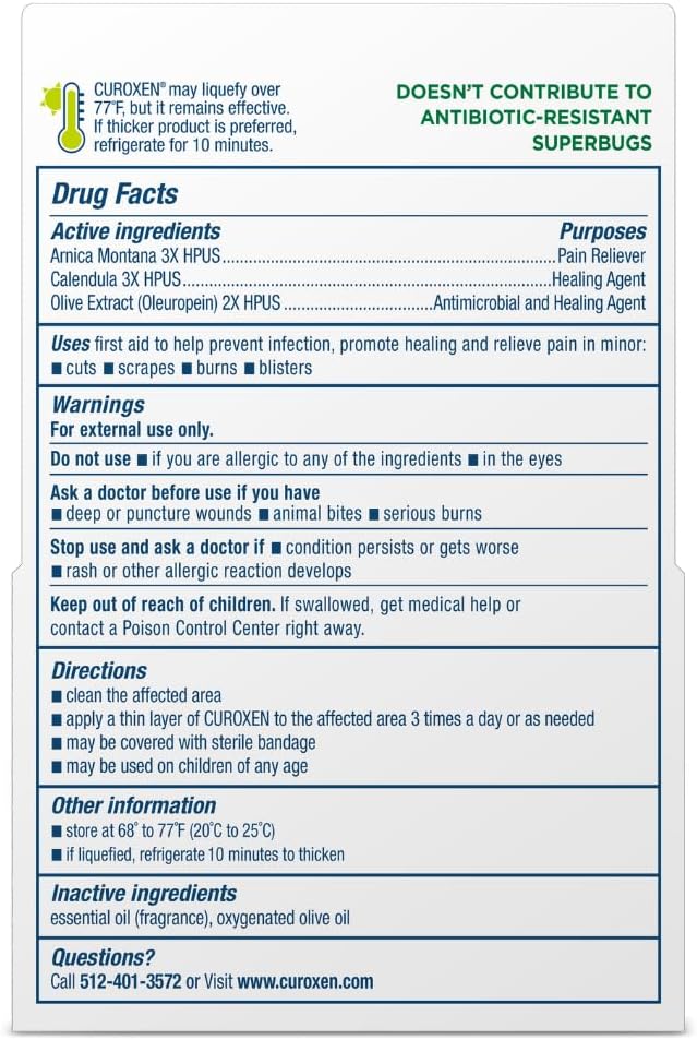 • FAST PAIN RELIEF: CUROXEN First Aid cream with Arnica offers fast pain relief for minor cuts, scrapes, burns, and blisters. Made from five all-natural, organic ingredients, CUROXEN First Aid with Arnica is simple yet effective.