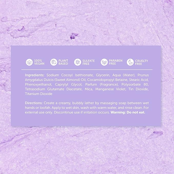• Say goodbye to harsh chemicals that irritate your skin. Our fluffy lavender whipped soap is paraben-free and sulfate-free, providing a gentle cleansing experience that won't strip your skin of its natural moisture. Loaded with natural ingredients like sweet almond oil and natural micas, our whipped soap is great for sensitive skin.