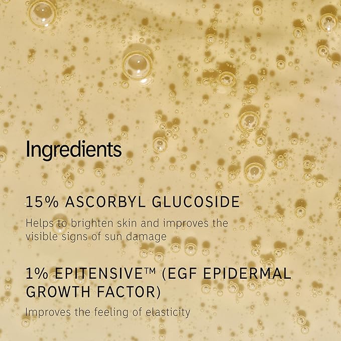 • POWERFUL INGREDIENTS - Powered by 15% Ascorbyl Glucoside; a stable form of antioxidant vitamin C; to help brighten skin and protect from damage caused by environmental aggressors together with plant-based peptide Epidermal Growth Factor (EGF) to help visibly regenerate skin’s appearance and improve the feeling of elasticity for firmer-looking skin
