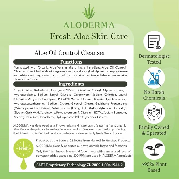 Aloderma Oil Controlling Facial Cleanser Made within 12 Hours of Harvest with Organic Aloe Vera - Clear Breakouts - Wintergreen to Help Purify & Deeeply Cleanse Pores - Calming Aloe Facial Wash, 3.5oz