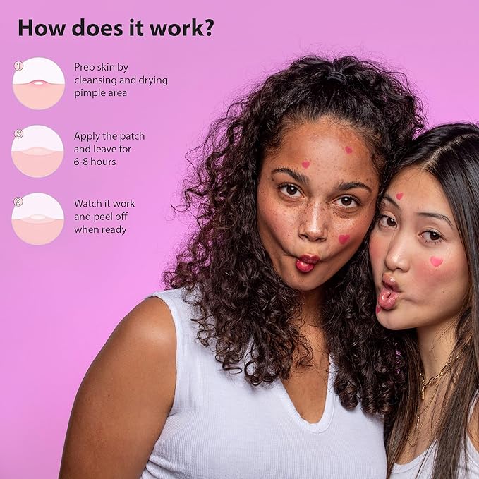 • HANDS OFF YOUR PIMPLES!: Send your zits packing without picking! Our stylish heart-shaped hydrocolloid patches are available in two sizes to beat breakouts and pamper your skin without harsh chemicals or drying ingredients. Brilliant!