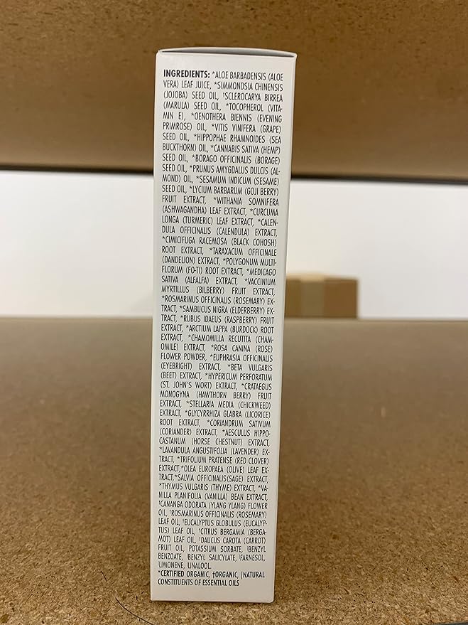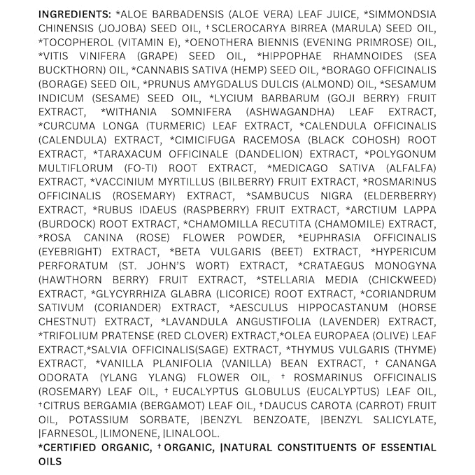 • Active Ingredients : *Aloe Vera Leaf Juice, *Jojoba Oil, †Marula Oil, *Vitamin E, *Evening Primrose Oil, *Grape Seed Oil,*Sea Buckthorn Oil, *Hemp Seed Oil, *Borage Seed Oil, *Almond Oil, *Sesame Oil, *Goji Berry, *Ashwagandha, *Turmeric, *Calendula, *Black Cohosh, *Dandelion, *Fo-Ti Root, *Alfalfa, *Bilberry, *Rosemary, *Elderberry, *Raspberry Leaf, *Burdock, *Chamomile, *Rose Hips, *Eyebright, *Beetroot, *St. John’s Wort, * Hawthorne Berry, *Chickweed, *Licorice, *Coriander, *Horse Chestnut, *Lavender, *Red Clover, *Olive Leaf, *Sage, *Thyme, *Vanilla Extract, †YlangYlang Essential Oil, †Rosemary Essential Oil, †Eucalyptus Essential Oil, †Bergamot (FCF) Essential Oil, †Carrot Essential Seed Oil, Potassium Sorbate *Aloe Vera Leaf Juice, *Jojoba Oil, †Marula Oil, *Vitamin E, *Evening Primrose Oil, *Grape Seed Oil,*Sea Buckthorn Oil, *Hemp Seed Oil, *Borage Seed Oil, *Almond Oil, *Sesame Oil, *Goji Berry, *Ashwag… See more