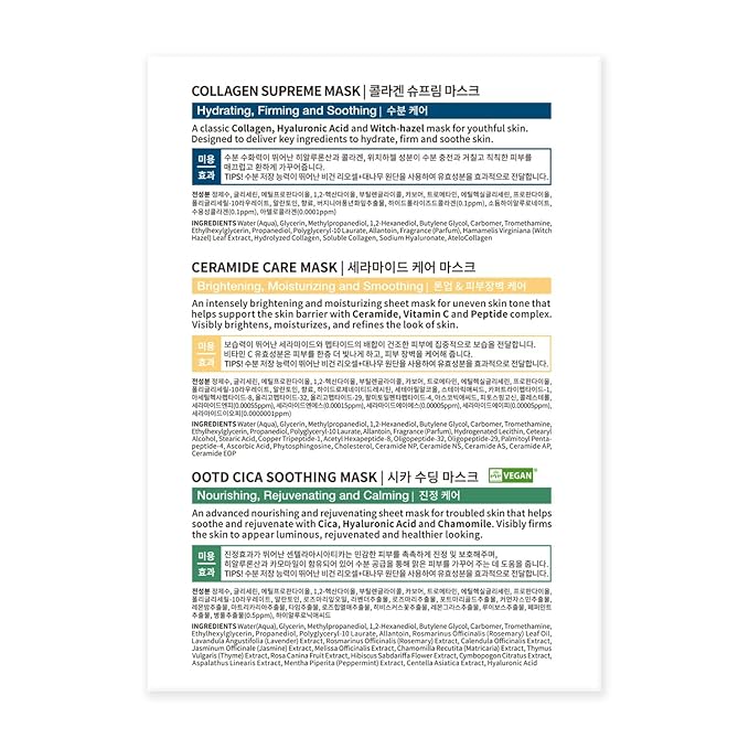 • CLINICALLY PROVEN TO WORK - All #OOTD products are clinically tested to prove its efficacy. COLLAGEN SUPREME MASK confirmed to hydrate, increase skin elasticity and optimize pH value of the skin. CERAMIDE CARE MASK to hydrate, increase skin elasticity, brighten the skin and optimize its pH value. CICA SOOTHING MASK confirmed to hydrate and increase skin elasticity.