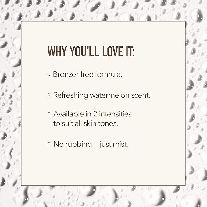 • CLEAN, REFRESHING & STREAK-FREE FINISH: Featuring a lightweight, bronzer-free formula, this alcohol-free tanning mist offers a transfer-free, mess-free experience with a refreshing watermelon scent. It’s non-comedogenic, non-sticky, and suitable for AM or PM application—perfect for layering under or over skin care and makeup without streaking or staining fabrics.