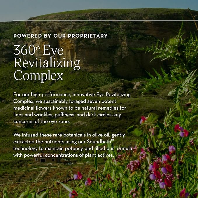 • 360º Eye Revitalizing Complex: A proprietary blend of 14 wild-foraged plants, including artichoke and dandelion, to lift, awaken, and revitalize the extended eye area.