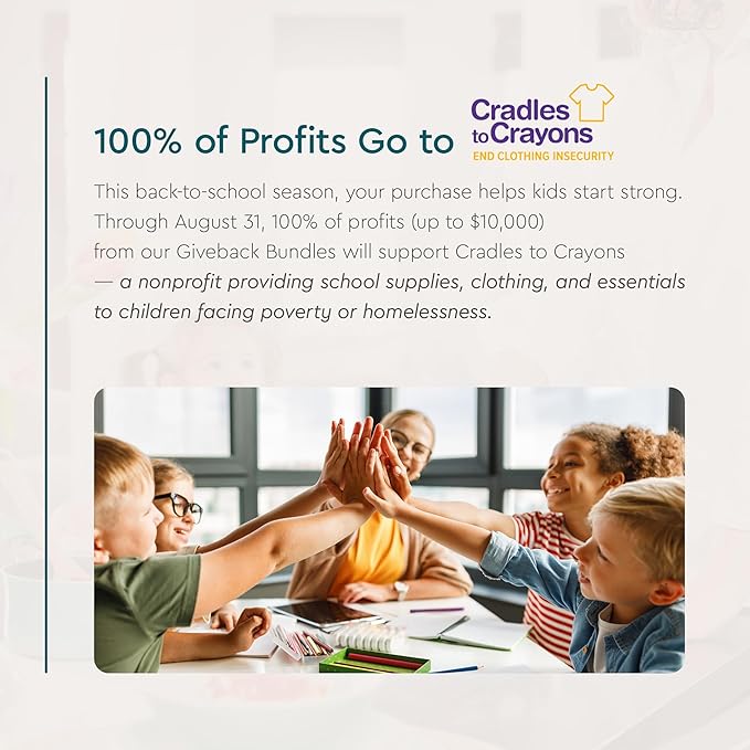 • Giveback Bundle: 100 percent of profits, up to 10,000 dollars, to be donated to Cradles to Crayons to help kids start school strong. This bundle includes cleaning essentials for the busy back-to-school season.