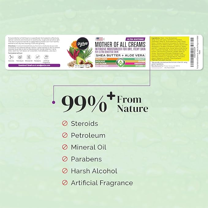 Puriya National Eczema Association Accepted Cream 2 oz, Dry Itchy Skin Relief, Colloidal Oatmeal Lotion, For Kids, Adults, Face, Hands, Mother of All Creams, Plant-Based Hydration,No Fragrance Added