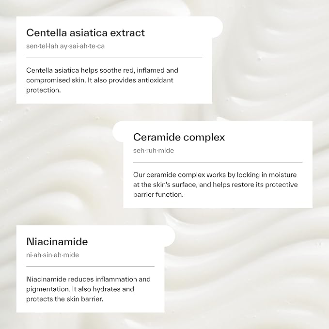 • Combination of ceramides & niacinamide lock in moisture & repair the skin barrier whilst cooling & soothing blemishes. Stimulates collagen production in your skin, improving its overall structure & reducing the appearance of fine lines & wrinkles