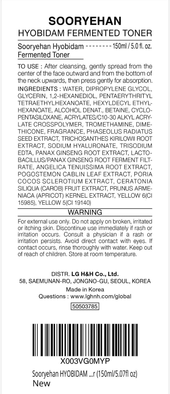 • SOORYEHAN HYOBIDAM FERMENTED TONER (150ml/5.1fl oz) delivers ample moisture and nourishment, transforming rough and dry skin into a soft, hydrated canvas.
