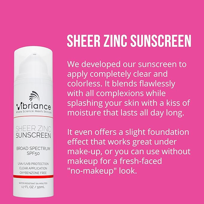 • Sheer zinc spf 50 sunscreen - Protect your skin from aging UV rays with Vibriance's Sheer Zinc Sunscreen. It applies clear, hydrates with Hyaluronic Acid, and nourishes with Niacinamide, offering broad-spectrum SPF 50 protection.