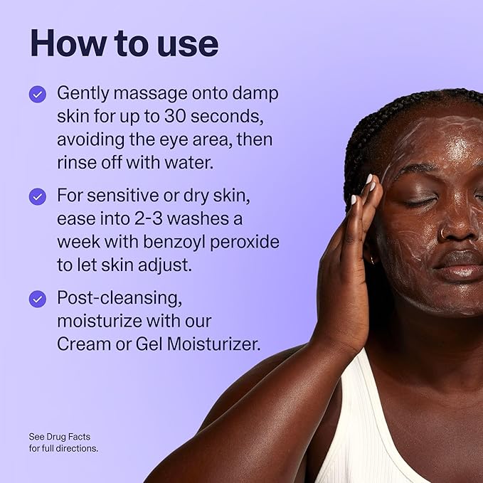 • EASE IN FOR BEST RESULTS – To help minimize redness or irritation, for sensitive or dry skin ease into 2-3 washes per week to let skin adjust to the Benzoyl Peroxide. Post-cleansing, moisturize with our Cream or Gel Moisturizer
