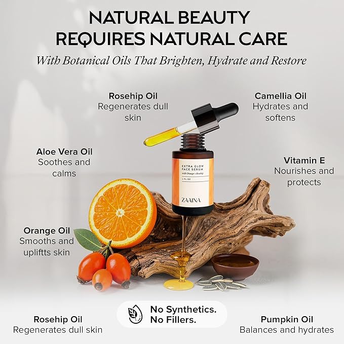 ZAAINA Extra Glow Face Serum – Hydrating Face Oil for Dry, Dull & Sensitive Skin – Lightweight Moisturizer & Natural Primer for Makeup – With Rosehip Oil, Pumpkin Seed & Vitamin E – 1oz Bottle